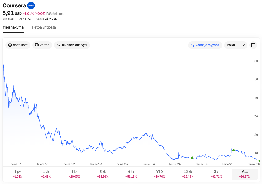 Portfolio moves in a market that feels expensive but not yet stupid. Coursera, ServiceNow, Bitcoin, and a Finnish small-cap nobody cares about.