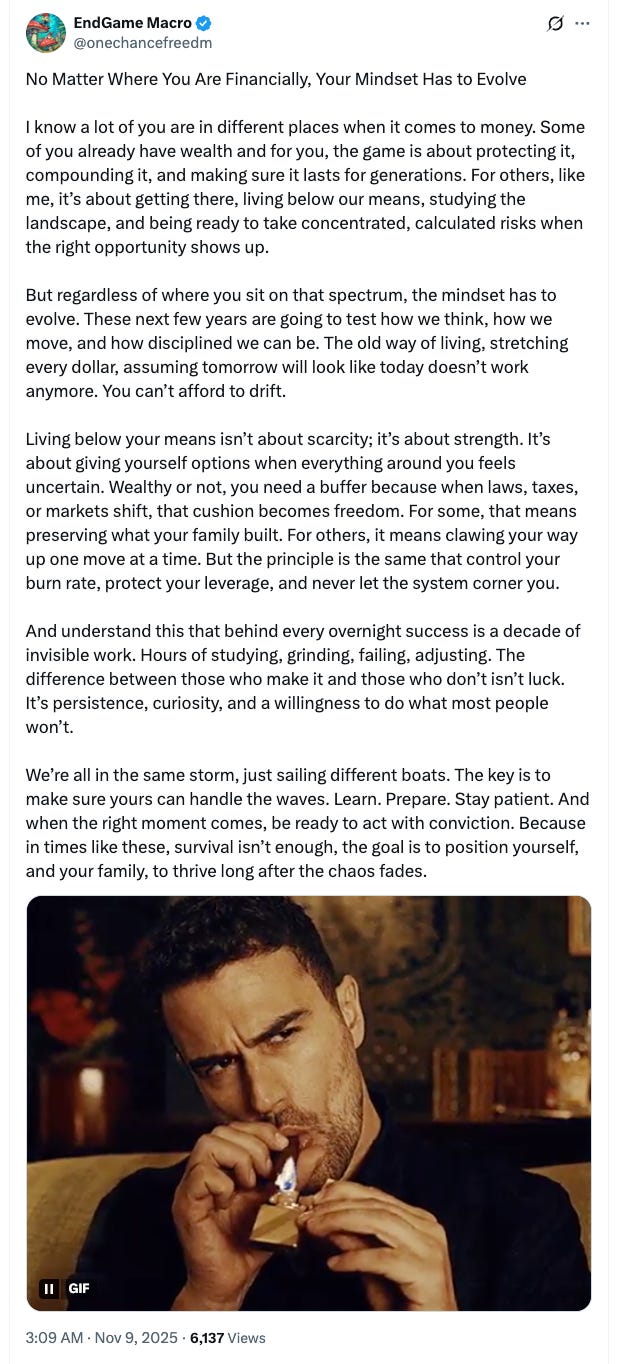 There’s minimal EV+ in gambling here. Time to read, think, live frugally, and position for what comes after the music stops. The clowns always get slaughtered last.