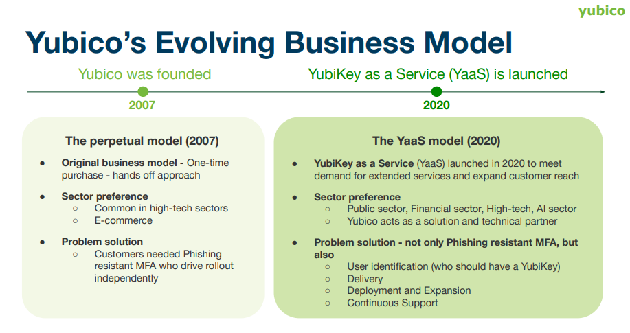 Keys are “buy once.” But they’re shifting to YubiKey-as-a-Service. Lower cost of entry, value captured over multiple years. The mix is what to watch.